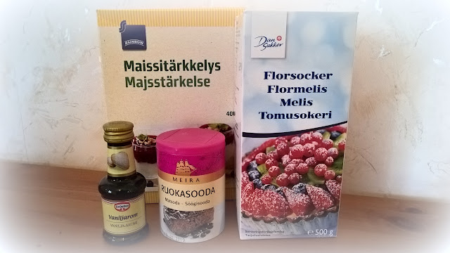 Työpäivän jälkeen ajelin siis ABC:lle ja hain pikapikaa paketin mukaan kotimatkalle ja siitä päästiinkin sitten itseasiaan! Olin päättänyt että otan kuvan paketista, kun saamani tuotteet ovat vielä nätisti paikoillaan paketissaan, mutta muistin tämän päätökseni vasta siinä vaiheessa kun tuotteet olivat nätissä pinossa pirttipöydällä. Hämmennyin niin paljon paketin sisällöstä että luulen kuvaamisen jääneen sen vuoksi taka-alalle. Tomusokeria, ruokasoodaa ja maissitärkkelystä. Loistavaa, näitä menee. Vanilja-aromi oli yllätys sillä en ole koskaan kokeillut kyseistä ainesosaa tässä muodossa. Toki vaniljasokeri on yhtä tuttua kuin kaurapuuron syönti mutta tämä oli kiva lisä pakettiin, kiitos!